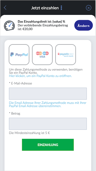 Banküberweisung oder andere Zahlungswege fehlen gänzlich. Dadurch hat man ganz klare Nachteile im Vergleich zur Konkurrenz, die oft auf eine Vielzahlung von Einzahlungsmethoden setzen. Mit PayPal hat man zwar einen der beliebtesten Anbieter, insgesamt ist das aber zu wenig. Der Mindesteinzahlungsbetrag liegt bei 5 Euro.