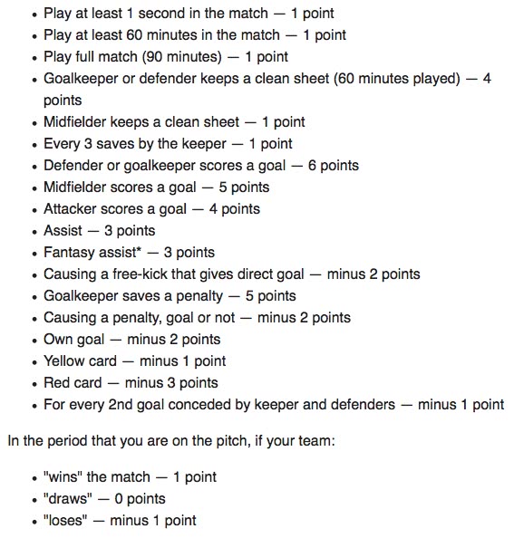 Bei allen Fantasy Sports Anbietern gibt es immer andere Punktebewertungen, jene von Fanteam sieht wie folgt aus (die Punktetabelle wurde am 28. Mai 2016 geändert ):