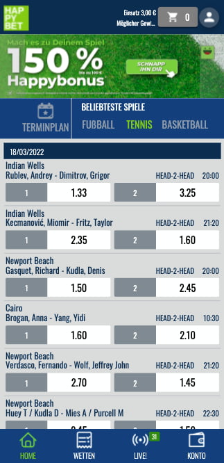 Damit kann HappyBet nicht ganz mit der Konkurrenz mithalten, die oft bis zu 100 oder mehr verschiedene Einzelwetten pro Match anbieten.
