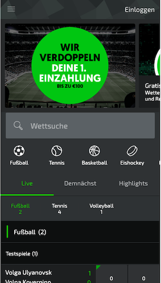Hier gibt es ein Menü für die beliebtesten Sportarten und eines für alle aktuellen Live-Wetten. Durch einen Wisch nach Rechts kannst du das ganze Angebot begutachten.
