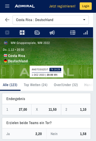 Wir haben uns die Quoten für Costa Rica gegen Deutschland in der Bwin App, der App von ADMIRAL und in der Tipico App angesehen. Oben findest du alle 1X2-Quoten für das Endergebnis und Halbzeitergebnis sowie weitere Tipps zum Spiel. Klicke einfach auf die Quote, wähle deinen Wetteinsatz und platziere im Anschluss beim Online-Bookie deine Wette.