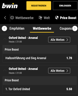 Bwin ist eine der Wett Apps bei denen du täglich neue Quotenboosts bekommst. Das gilt auch für Oxforder gegen Arsenal am 9. Januar 2023. Für die Partie nach dem Motto David gegen Goliath kannst du dir gleich zwei Bwin Price Boosts sichern. Diese gibt es für alle Kunden des Bookies, die einen verifizierten Wett-Account besitzen. Diese Tipps stehen für dich im Angebot: